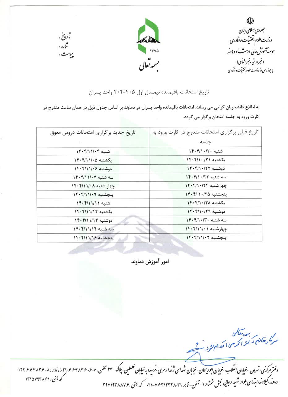 بر اساس اطلاعیه مورخ 29 دی 1404 معاونت محترم آموزش و پژوهش موسسه جناب آقای دکتر شجاع، زمانبندی امتحانات معوق واحد دماوند (20 دی تا 2 بهمن) به شرح زیر از 4 تا 16 بهمن برقرار می باشد:
