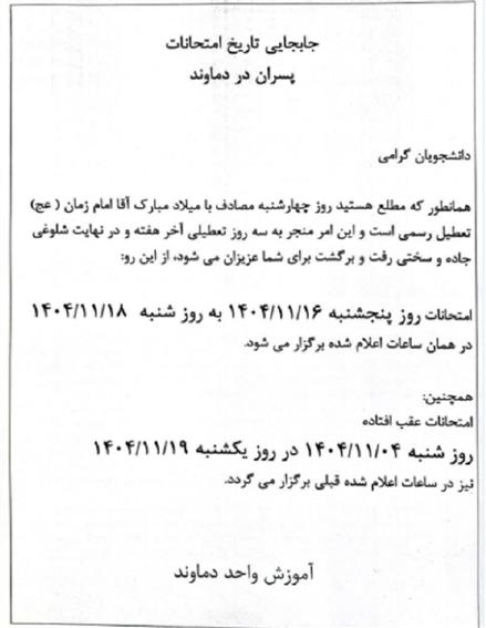 اطلاعیه شماره 331- اطلاعیه مهم واحد دماوند، پسران در مورد جابه جایی تاریخ امتحانات