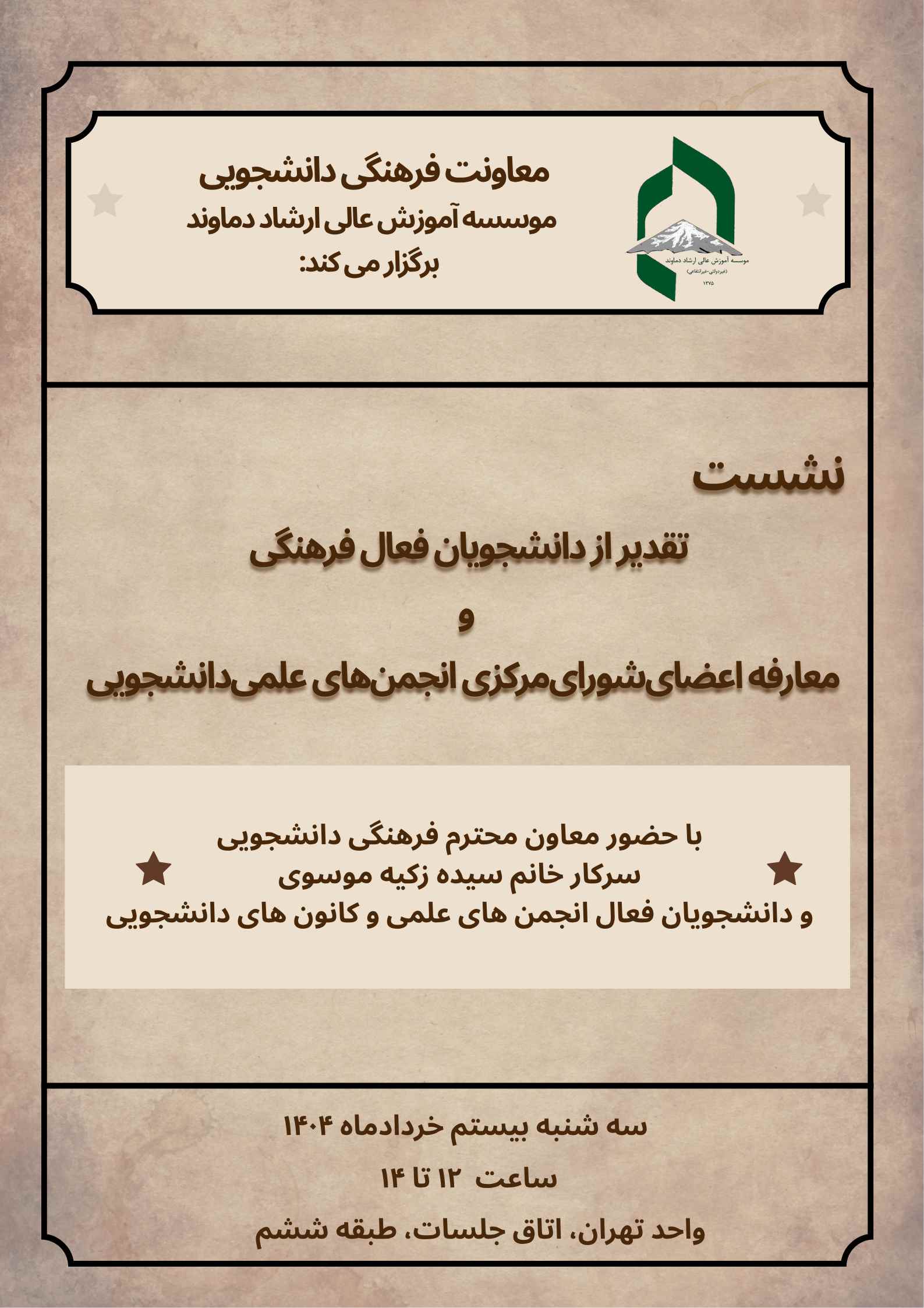 اطلاعیه شماره 102- نشست تقدیر از دانشجویان فعال فرهنگی